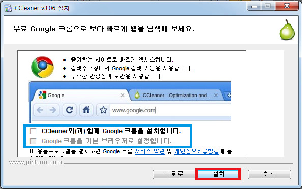 구글 크롬을 설치할건지 결정을 하고, "설치" 버튼을 눌러줍시다.